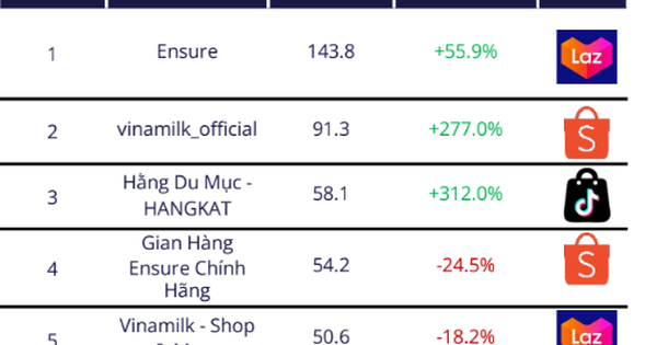 Ngược lại, các thương hiệu nội địa như TH True Milk – doanh số 63,1 tỉ đồng (+57,3%), Vinamilk – doanh số 147,8 tỉ đồng (+46%), thương hiệu cá nhân Hằng Du Mục – doanh số 58,7 tỉ đồng (+434,4%) có tốc độ tăng trưởng tốt.