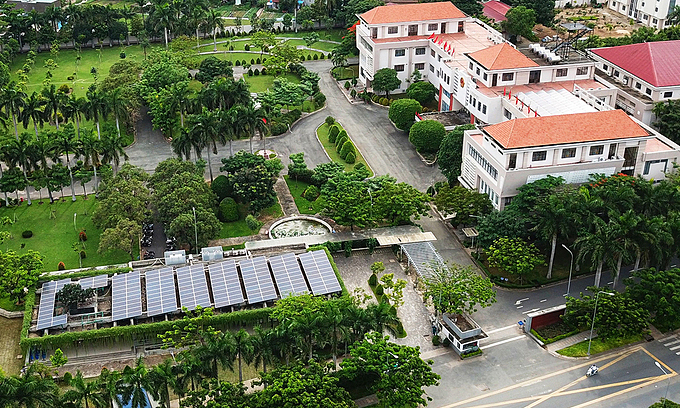 Hệ thống điện mặt trời lắp trong khuôn viên UBND quận 12. Ảnh: Quỳnh Trần.