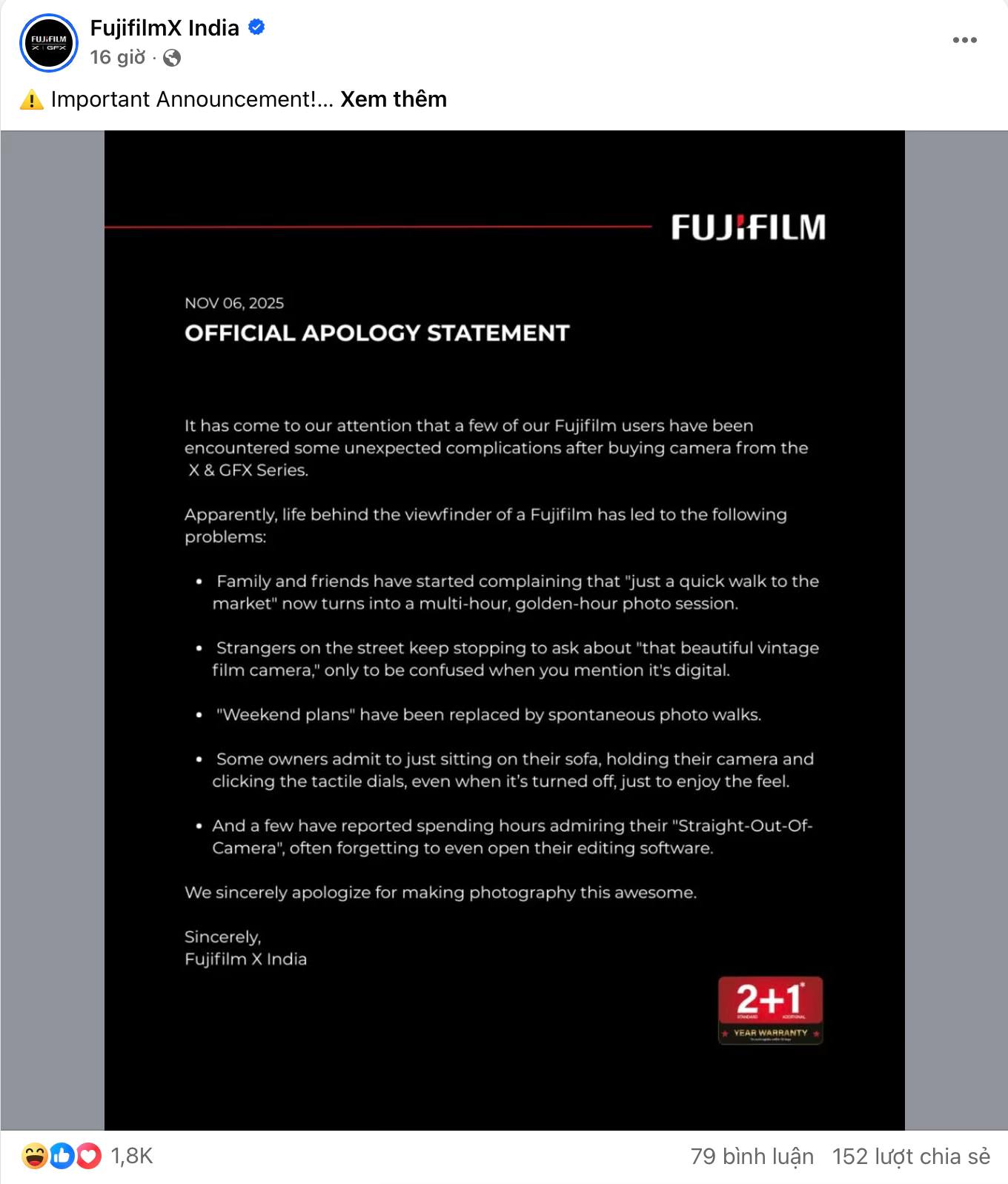 Có thể thấy, kiểu “xin lỗi vì tốt quá” này không phải chuyện mới trong giới marketing. Fujifilm Ấn Độ mới đây từng tạo nên hiệu ứng tương tự khi đăng tải “Official Apology Statement” của riêng họ vào đầu tháng 11. Trong đó, hãng máy ảnh Nhật Bản “thành khẩn” nhận lỗi vì khiến người dùng say mê nhiếp ảnh đến mức bị người thân phàn nàn. “Một số người chỉ định ra chợ một lát, nhưng cuối cùng biến nó thành buổi chụp ảnh kéo dài hàng giờ, đúng vào giờ vàng”, bản tuyên bố viết. Có người lại “chỉ ngồi trên ghế sofa, vặn núm chỉnh máy ảnh dù đang tắt, chỉ để cảm nhận cảm giác chạm”, hay “dành hàng giờ ngắm ảnh chụp thẳng từ máy đến quên cả mở phần mềm chỉnh sửa.”