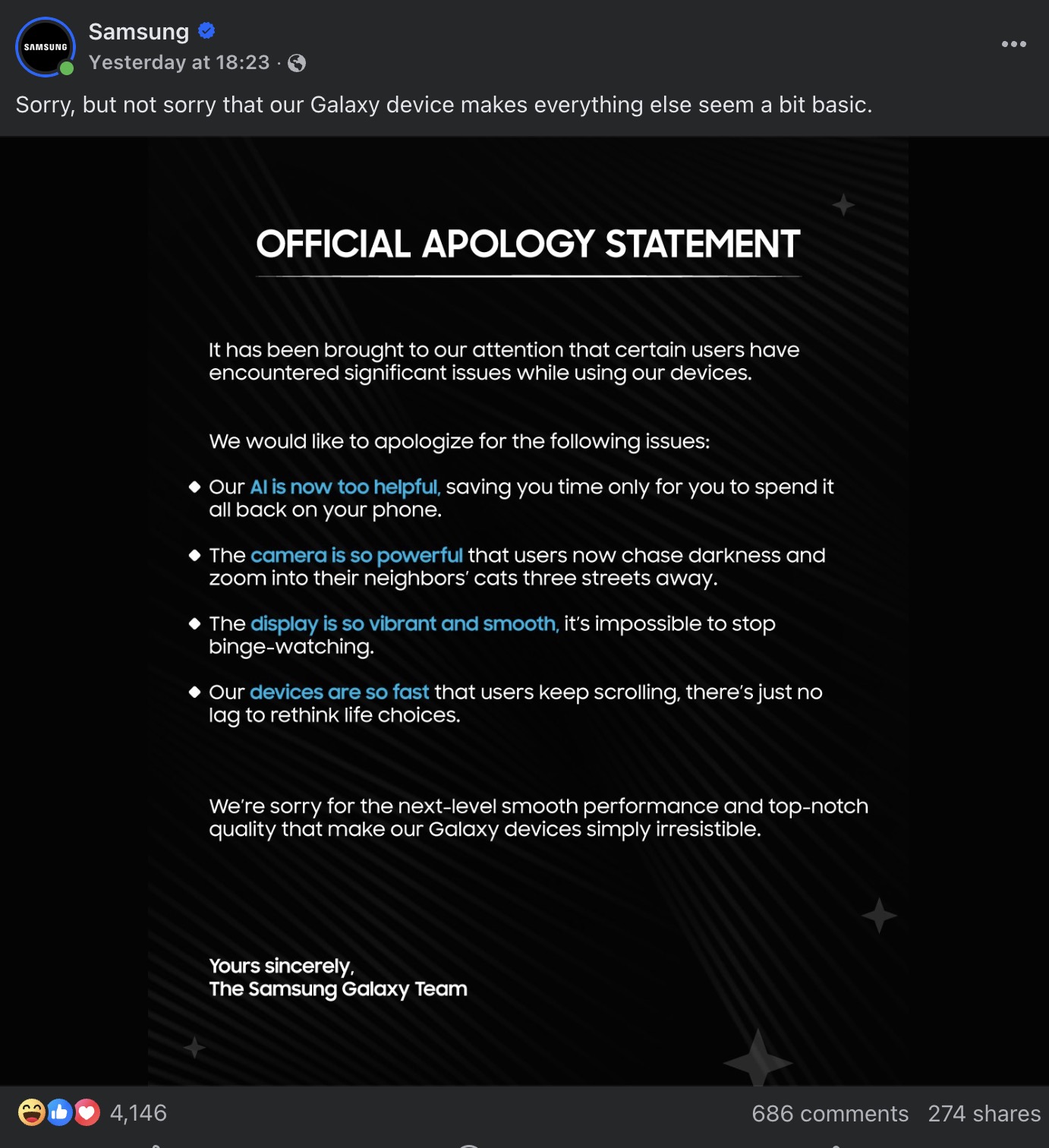 Trong bức ảnh, dòng mở đầu viết trang trọng: “It has been brought to our attention that certain users have encountered significant issues while using our devices.” – tạm dịch: “Chúng tôi được biết rằng một số người dùng gặp phải những vấn đề nghiêm trọng khi sử dụng thiết bị của chúng tôi.” Nhưng khi kéo xuống, người đọc nhận ra đây không phải lời xin lỗi thông thường. Samsung liệt kê hàng loạt “sự cố” mà hãng phải “chịu trách nhiệm”: trí tuệ nhân tạo quá hữu ích khiến người dùng tiết kiệm được thời gian chỉ để… dùng điện thoại nhiều hơn; camera quá mạnh đến mức “người dùng giờ có thể zoom tới những chú mèo ở ba con phố xa”; màn hình quá mượt khiến “không thể dừng xem phim”; và thiết bị quá nhanh đến mức “không có độ trễ để kịp suy nghĩ về cuộc đời”.