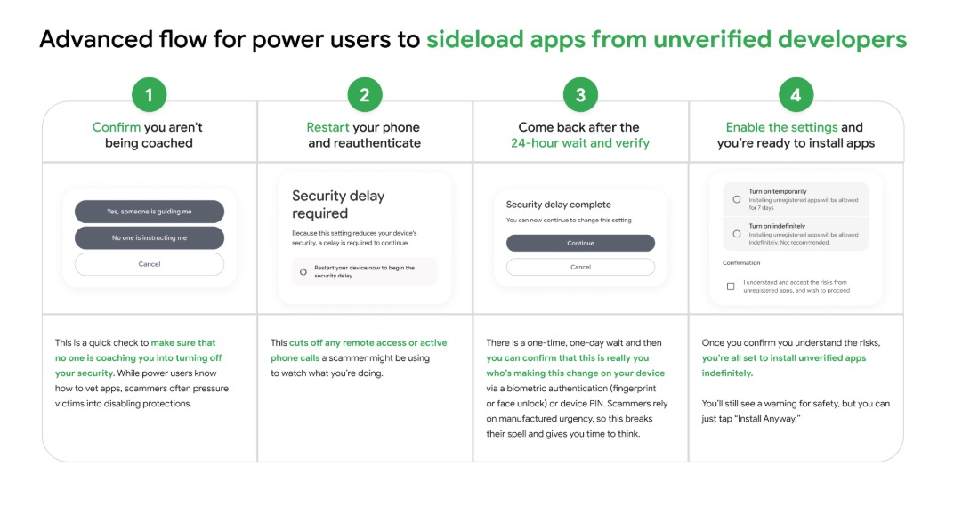 Hãng vừa chính thức công bố chi tiết quy trình “luồng nâng cao” (advanced flow) dự kiến tung ra vào tháng 8 tới đây. Mục tiêu của quy trình này là siết chặt việc cài đặt ứng dụng từ các nhà phát triển chưa được xác minh, hay nói cách đơn giản là cài đặt các file APK trôi nổi bên ngoài Play Store. Quy trình mới được thiết kế như một chốt chặn, nhằm bảo vệ người dùng khỏi sự thao túng của tội phạm mạng.