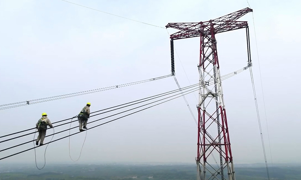 Thứ tư, 10/5/2023, 06:03 (GMT+7) Đường dây truyền tải điện siêu cao áp 800 kV bắc qua sông Dương Tử, sông dài nhất châu Á, được bảo trì bằng cả