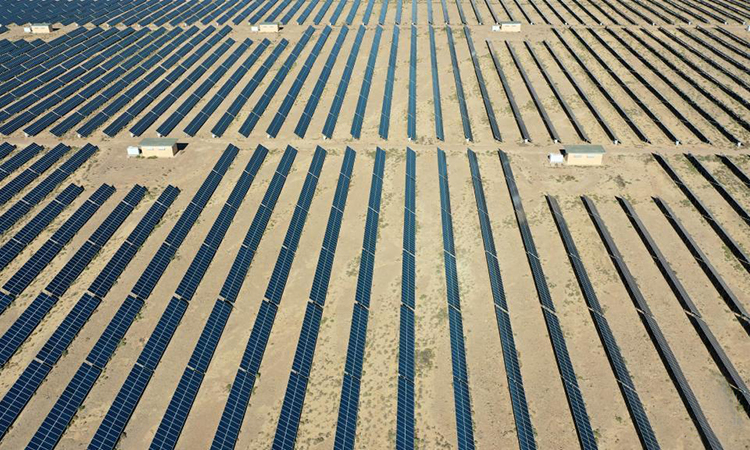 Trại Quang điện Xipo ở Cam Túc. Ảnh: Xinhua Hệ thống do Tập đoàn Huaneng của Trung Quốc phát triển được lắp đặt tại trại quang điện Xipo ở thành